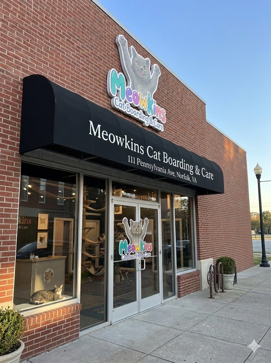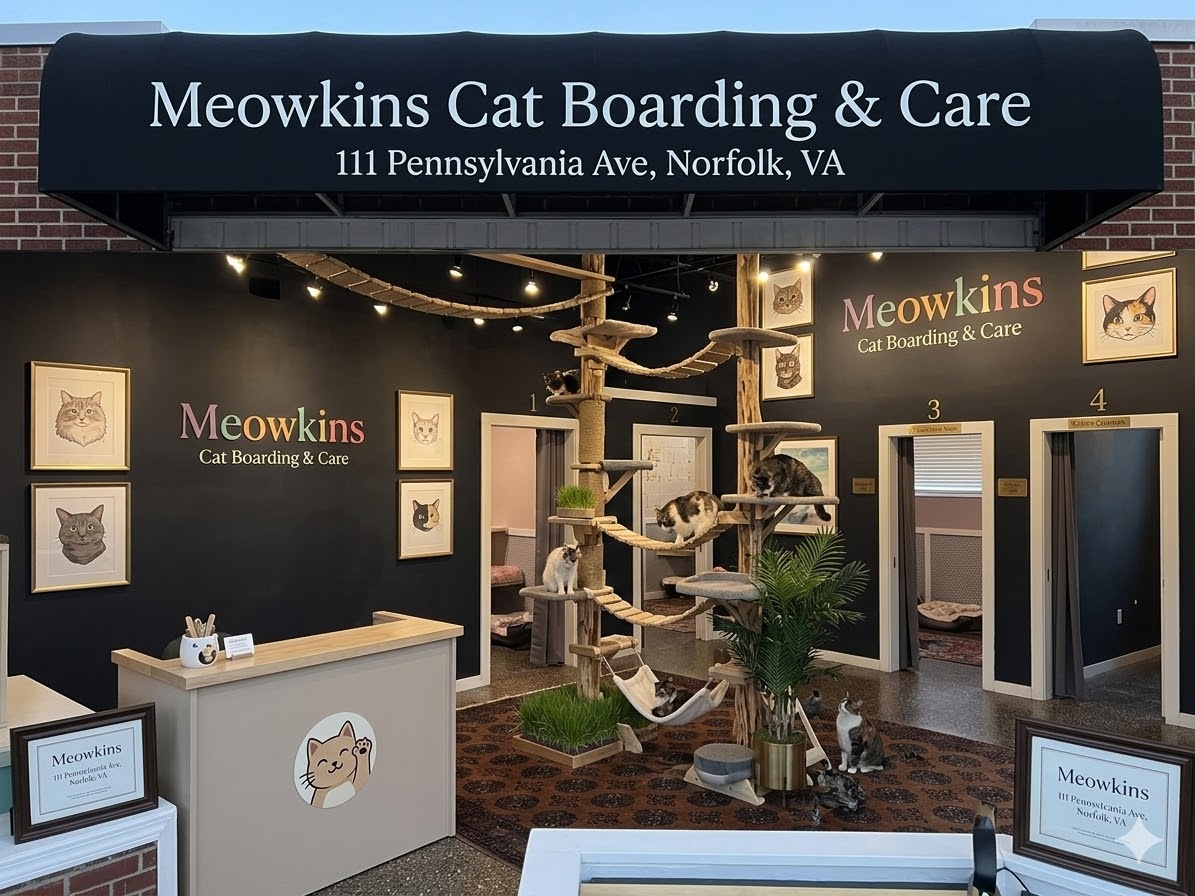 We are currently in the pre-opening phase while rezoning, planning, and luxury build-out are being completed. Meowkins will soon offer a stress-free, fear-free sanctuary designed exclusively for cats in Norfolk. Join our waitlist to stay updated on our progress.